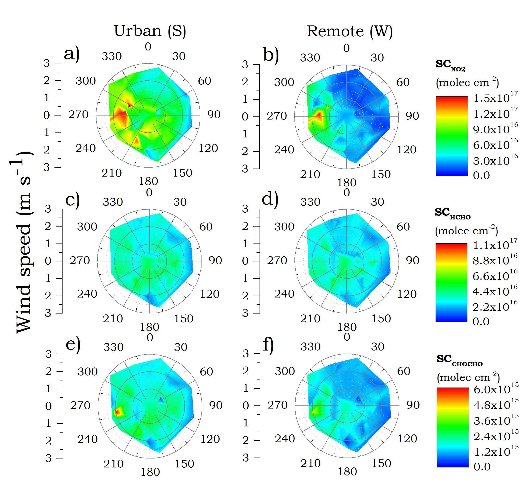 Daily SC density values for NO2 (a, b), HCHO (c, d) and CHOCHO (e, f) as a function of wind direction, for remote (right column) and urban (left column)