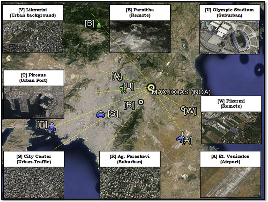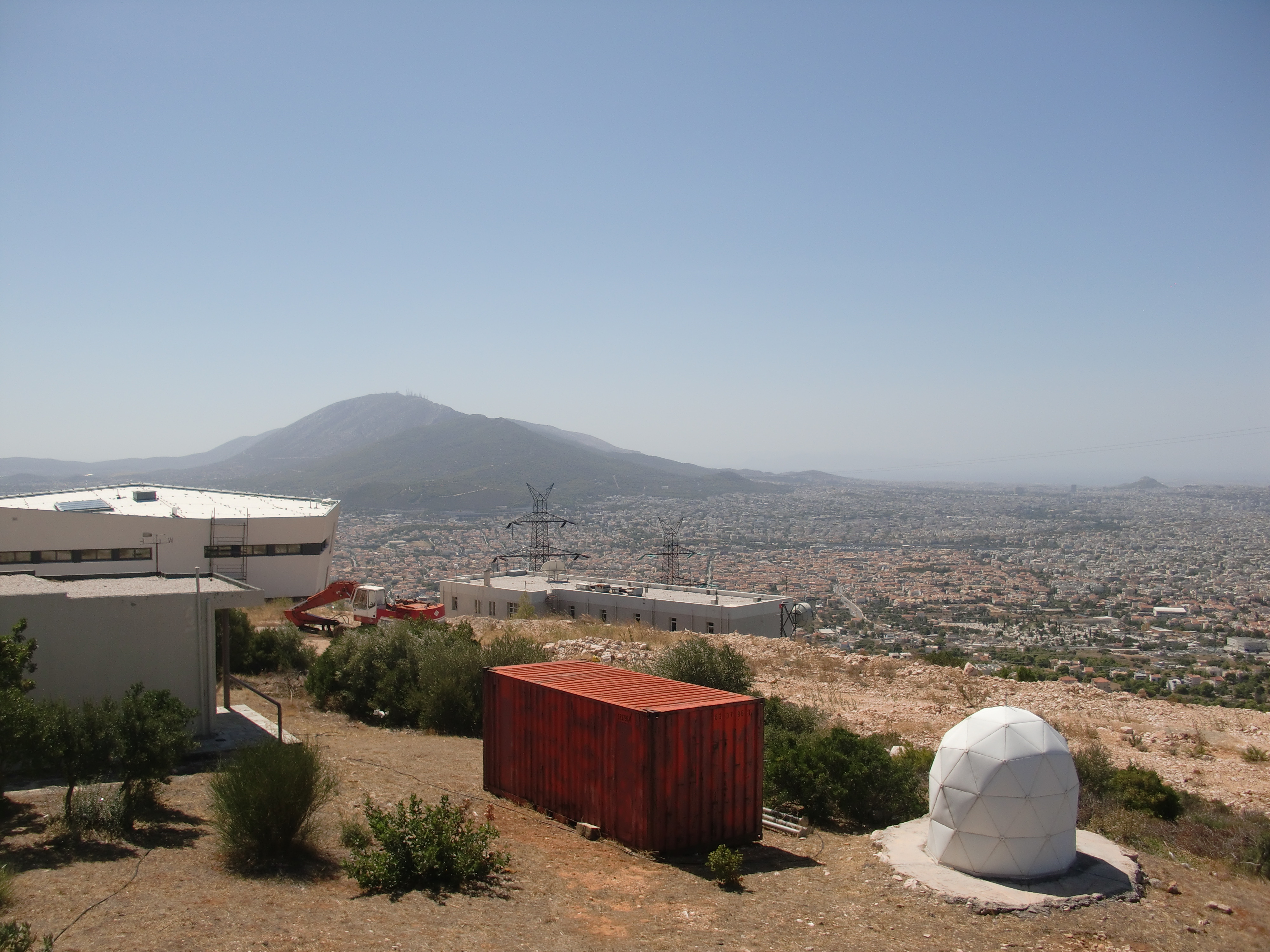 The MAX-DOAS instrument is installed at the premises of the National Observatory of Athens in Penteli (38.05οN, 23.86οE, 527 m a.s.l). It operates in collaboration with the University of Bremen and it is part of the BREDOM network (Bremian DOAS network for atmospheric measurements, http://www.iup.uni-bremen.de/doas/groundbased_data.htm). Briefly, the instrument comprises a telescope unit, connected to a grating spectrometer equipped with a cooled CCD detector. The telescope unit is mounted on a pan-tilt head in order to be able to point towards any direction in the sky. During routine operation, spectral measurements are performed at various azimuth and elevation angles, providing information on the horizontal and vertical distribution of certain trace gases (NO2, HCHO, CHOCHO, O4). Furthermore, the SCD of oxygen dimer (O4) measured at different elevations can be used as input to the BOREAS retrieval algorithm for the calculation of the aerosols’ vertical distribution. The measurements cover the whole Athens basin.