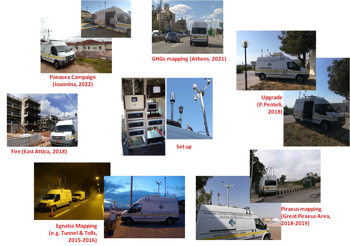 The National Observatory of Athens (NOA) conducts atmospheric pollution measurements in Attica since 1970s. In 1996 the Mobile Air Quality Monitoring Station (Mobile AQMS) was developed, to meet the rising needs for mobility and flexibility in conducting measurements at remote or non-fixed locations. The Mobile AQMS is a van-type vehicle continuously upgraded to be able to carry tailored instrumentation that meets ad hoc requirements for high resolution measurements of pollutants, under different air pollution conditions. It is used either for in-situ measurement campaigns of scientific interest (e.g. within the frame of PANACEA NRI), or on a service basis in collaboration with local authorities, the state and private bodies, which pose a relevant claim and needs. Ιt is also activated during specific events, like industrial accidents, wild-fires etc, to monitor level and perform mapping of impacts in the influenced areas. The standard on-board equipment includes a set of gas analyzers (CO, NO, NO2, SO2, O3), particulate matter and black carbon monitors (PM10, BC and its BCff-BCwb fractions) as well as a meteorological station.